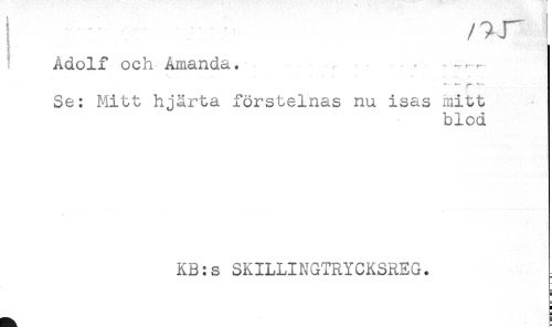 //// Adolf och Amanda. ^ . . ... //// Se: Mitt hjärta förstelnas nu isas mitt //// blod //// KB:s SKILLINGTRYCKSREG. //// 5 //// ) //// S ////