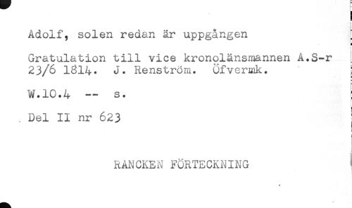 //// Adolf, solen redan ar uppgången //// Gratulation till vice kronolänsmannen A.S-r //// 23/6 1814. J. Renström. Öfvermk. * //// E //// W.10.4 — s. ! //// r //// * //// ) //// . Del II nr 623 ! //// { //// ! //// - //// RANCKEN FÖRTECKNING i //// * //// w ////
