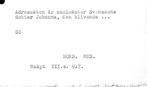 //// Adressaten är skolmästar Svenssons //// dotter Johanna, den blivande ... //// Sö //// NORD. MUS. //// Mskpt III.s. 917. ////