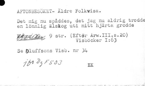 //// AFTONBESÖKET- Äldre Folkvisa. //// Det mig nu spåddes, det jag nu aldrig trodde //// en lönnlig älskog uti mitt hjärta grodde //// 9 str. (Ef t gr Arw.III.s.20) //// Visböcker 1:63 //// Se &luffsons Visb. nr 34 //// /l ' J EK //// * //// .... . . -.,.1 ..^-t^-*. .... ..UV' ..... ^ M+' i Sif.-'' . - ^ . .1.*., ////