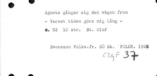 //// Agneta gångar sig den vägen fram //// * //// - Varest tiden görs mig lång - //// d. 92 10 str. St. Olof //// Svensson Folkv.fr. SÖ Sk. FOLKM. 1929 ////
