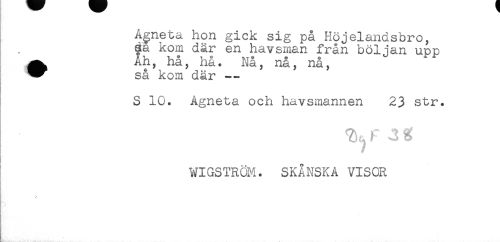 //// Agneta hon gick sig på Höjelandsbro, //// aa kom där en havsman från böljan upp //// ^ Ah, hå, hå. Nå, nå, nå, //// ^^ så kom där — //// S 10. Agneta och havsmannen 23 str. //// -3% //// } //// WIGSTROM. SKÅNSKA VISOR //// T*** ////