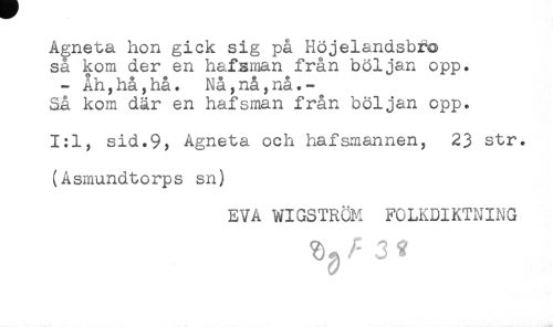 //// Agneta hon gick sig på Hojelandsbre //// så kom der en hafsman från böljan opp. //// - An,hå,ha. Nå, nå, nå. - //// Så kom där en hafsman från böljan opp. //// 1:1, sid.9? Agneta och hafsmannen, 23 str. //// (Asmundtorps sn) //// EVA WIGSTRÖM FOLKDIKTNING //// ^ 3 % ////