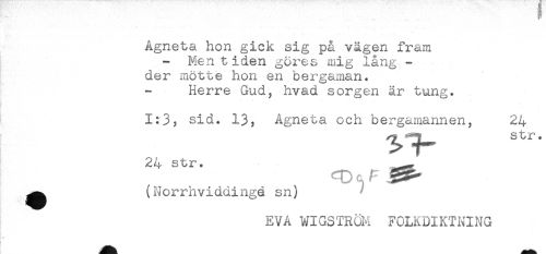 //// * ' . - — .-*-' //// Agneta hon gick sig på vägen fram //// Men t iden göres mig lång - //// der mötte hon en bergaman. //// Herre Gud, hvad sorgen är tung. //// 1:3? sid. 13? Agneta och bergamannen, 24 //// ^ ^ str. //// > t" //// 24 str. //// ^^ (Norrhviddingé sn) //// EVA WIGSTRÖM FOLKDIKTNING ////
