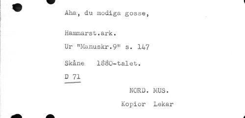 //// j Aha, du modiga gosse, //// t- //// I Hammarst.ark. //// Ur "Manuskr.9" s. 147 //// Skåne 1330-talet. //// D 71 //// NORD. MUS. //// Kopior Lekar ////