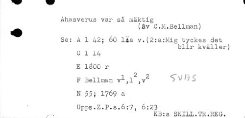 //// Ahasverus var så mäktig //// ^ (&v C.M.Bellman) //// Se: A 1 42; 60 l^a v.(2:a:Mig tyckes det //// blir kväller) //// C 1 14 //// E 1600 r //// F Bellman v^l^v^ //// N 55; 1769 a //// Upps.Z.P.s.6:7, 6:23 //// KB:s SKILL.TR.REG. //// / //// /