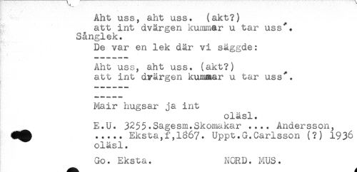 //// Ant uss, ann uss. ^axnv; //// att int dvärgen kummar u tar uss". //// Sånglek. //// De var en lek där vi säggde: //// . //// Aht uss, aht uss. (akt?) //// att int dvärgen kummar u tar uss". //// Mair hugsar ja int //// oläsl. //// _ E.U. 3255*Sagesm.Skomakar .... Andersson, //// ..... Eksta,f,l367. Uppt.G.Carlsson (?) 1936 //// oläsl. //// Go. Eksta. NORD. MUS. ////