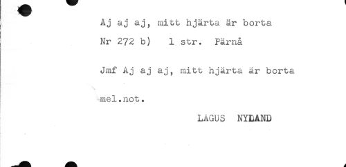 //// j Aj aj aj, mitt hjärta är borta //// ! Nr 272 b) 1 str. Färnå //// Jmf Aj aj aj, mitt hjärta är borta //// * //// mel.not. //// * //// LAGUS NYEAND //// * //// ^ t //// _ ////