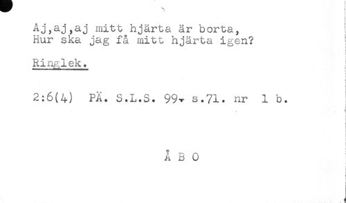 //// Aj,aj,aj mitt hjärta är borta. //// Hur ska jag få mitt hjärta igen? //// s- //// ! //// Ringlek. ! //// ! //// i //// f //// 2:6(4) PÄ. S.L.S. 99v s.7i. nr 1 b. //// ( //// ' j //// i //// f //// i //// } //// ÅBO //// i //// t //// < ////