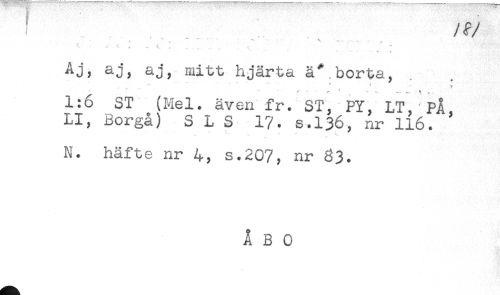 //// / <r //// /^ - ^ ' - < . , . < ' //// Aj, aj, aj, mitt hjärta ä" borta, //// 1:6 ST (Mel. även fr. ST, PY, LT, PÅ //// LI, Borgå) S L S 17. s.136, nr 116. ' //// <? * *' .. - //// N. häfte nr 4, s.207, nr 83. ////