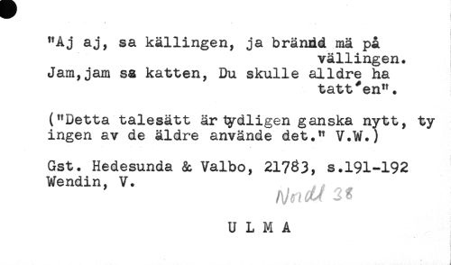 //// "Aj aj, sa källingen, ja brändd mä på //// vällingen. //// Jam,jam sa katten, Du skulle alldre ha //// tatt*en". //// ("Detta talesätt är tydligen ganska nytt, ty //// ingen av de äldre använde det." V.W.) //// Gst. Hedesunda & Valbo, 21733, s.191-192 //// Wendin, V. //// U L M A //// ' . J ////