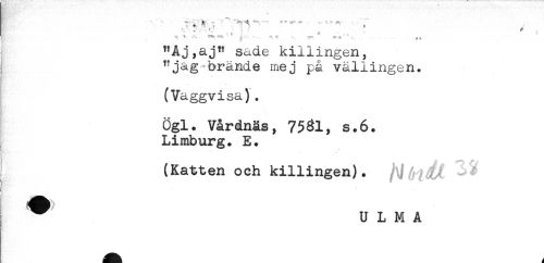 //// % *. .-v ? ' - - - - * //// ?J . - - ^ ' - //// > 1 __ftr ^ * , ^ //// , t, r; *r*. - ^ ? .. ^ (P* i t . //// "Aj,aj" sade killingen, //// : "jag-brände mej på vällingen. //// (Vaggvisa). //// Ögl. Vårdnäs, 75^1, s.6. //// Limburg. E. //// (Katten och killingen). /-J //// ^ U L M A ////