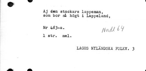 //// Aj den stackars lappeman, //// som bor så högt i Lappeland, //// 1 str. mel. //// LAGUS NYLANDSKA FOLKV. 3 ////