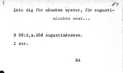 //// Akta dig för månsken syster, för augusti- //// månsken mest... //// t //// [ //// i //// t //// B 98:2,s.263 Augustimånsken. ! //// 2 str. //// -1 //// ! //// i //// RA ! //// i //// ! ////
