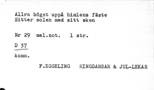//// Allra högst uppå himlens fäste //// Sitter solen med sitt sken //// < //// i //// t //// Nr 29 mel.not. 1 str. //// * //// D 57 //// komm. //// F.EGGELING RINGDANSAR & JUL-LEKAR ////