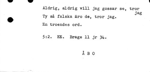 //// Aldrig, aldrig vill jag gossar se, tror //// jag //// ^ Ty så falska är o de, tror jag. //// En troendes ord. //// 5:2. EE. Brage 11 jr 34. //// ÅBO //// ____ ___ _ //// /