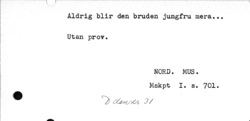 //// Aldrig blir den bruden jungfru mera... //// t //// t //// * //// I Utan prov. //// i //// i //// ! //// A //// ( //// i //// t //// NORD. MUS. //// Mskpt 1. s. 701. ////