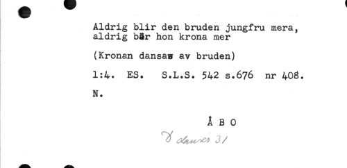 //// Aldrig blir den bruden jungfru mera, //// aldrig b8r hon krona mer //// (Kronan dansaw av bruden) //// 1:4. ES. S.L.S. 542 s.676 nr 403. //// N. //// ÅBO //// ^ J //// /