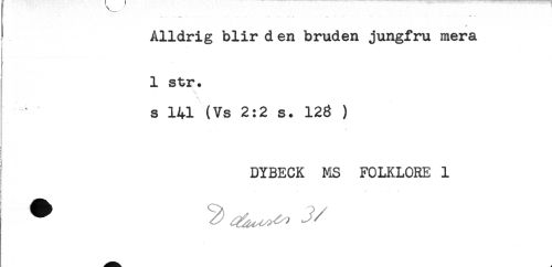 //// + //// Alldrig blir d en bruden jungfru mera //// 1 str. //// s 141 (Vs 2:2 s. 128 ) //// DYBECK MS FOLKLORE 1 ////