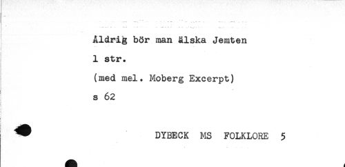 //// * //// : s * //// Åldrig bör man älska Jemten //// 1 str. //// (med mel. Moberg Excerpt) //// s 62 //// i //// i //// < //// ) //// ^ DYBECK MS FOLKLORE 5 ////