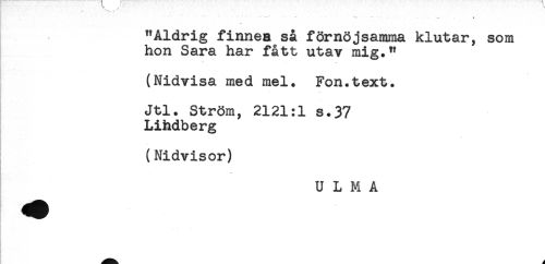 //// "Aldrig finnea så förnöjsamma klutar, som //// hon Sara har fått utav mig." //// - //// (Nidvisa med mel. Fon.text. //// - //// Jtl. Ström, 2121:1 s.37 //// Lihdberg //// (Nidvisor) //// U L M A //// L ////