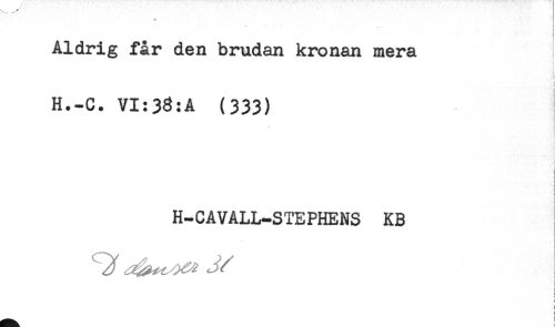 //// Aldrig får den brudan kronan mera //// t //// t //// < //// i //// t //// H.-C. VI:38:A (333) //// * //// t //// i //// I //// ( //// i //// ) //// ! //// ! //// * //// t //// ! //// H-CAVALL-STEPHENS KB //// ... //// i //// ! //// ) ////
