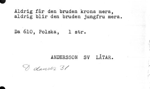 //// Åldrig får den bruden krona mera, //// aldrig blir den bruden jungfru mera. //// Da 610, Polska, 1 str. //// 'i //// ' I //// ANDERSSON SV LÅTAR. //// i //// r ////