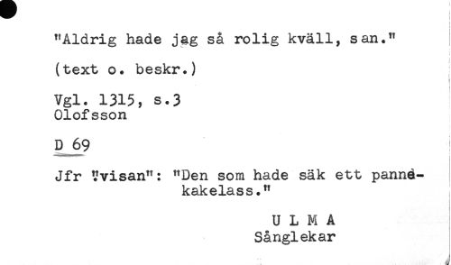 //// "Aldrig hade jag så rolig kväll, san." //// (text o. beskr.) //// ! //// Vgl. 1315, s.3 //// Olofsson //// D 69 //// Jfr Tvisan": "Den som hade säk ett panné- //// kakelass." //// i //// t //// i //// U L M A //// Sånglekar ////