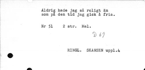 //// Aldrig hade jag så roligt än //// som på den tid jag giek å fria. //// % //// Nr 51 2 str. Mel. //// T) ^ //// R //// T ., . //// RINGL. SKANSEN uppl.4 ////