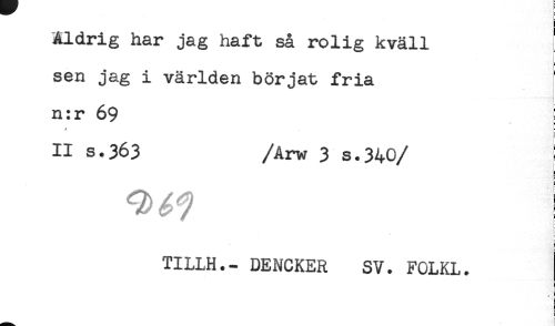 //// Aldrig har jag haft så rolig kväll //// sen jag i världen börjat fria //// n:r 69 //// C //// ' - r //// C //// II s.363 /Arw 3 s.340 //// /! //// L //// i //// t //// i //// t //// TILLH.- DENCKER SV. FOLKL. ////