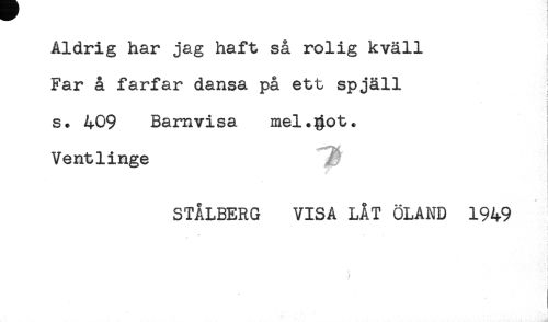 //// Aldrig har jag haft så rolig kväll //// Far å farfar dansa på ett spjäll I //// < //// i //// s. 409 Barnvisa mel.$ot. //// Ventlinge ^ //// -i* //// STÅLBERG VISA LÅT ÖLAND 1949 //// t //// ! //// i //// * . * i //// J ////