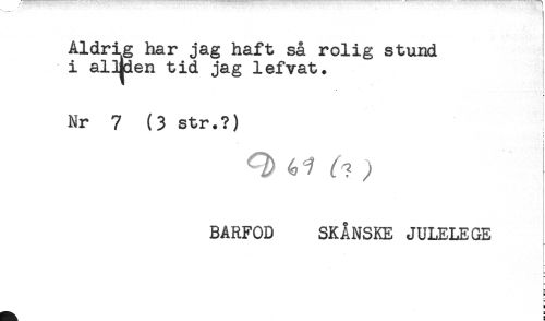 //// Aldrig har jag haft så rolig stund //// i aHjden tid jag lefvat. //// Nr 7 (3 str.?) //// - //// ! //// BARFOD SKÅNSKE JULELEGE //// L //// L //// j* //// = //// : //// i ////