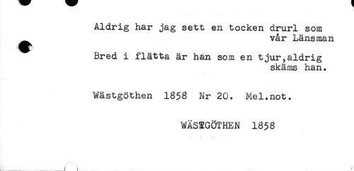 //// Aldrig har jag sett en töcken drurl som //// vår Länsman //// Bred i flätta är han som en tjur,aldrig //// skäms han. //// Wästgöthen 1353 Nr 20. Mel.not. //// WASEGÖTHEN 1858 //// -.....t ! ////