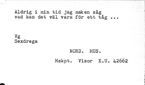 //// Aldrig i min tid jag maken såg ' //// vad kan det väl vara för ett tåg ... //// j- //// < //// i //// t //// i //// ) //// Vg //// Sexdrega //// i //// ! //// ) //// NORD. MUS. //// < //// f //// i //// Mskpt. Visor E.U. 42662 //// r //// 5 //// t //// B //// E ////