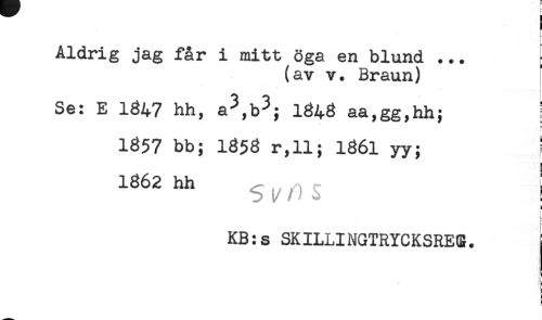 //// Aldrig jag får i mitt öga en blund ... E //// (av v. Braun) } //// * //// Se: E 1847 hh, 1343 aa,gg,hh; ; //// 1857 bb; 1858 r,ll; 1861 yy; ' //// 1362 hh ^, ; //// i //// ! //// L //// KB:s SKILLINGTRYCKSREG}. ////