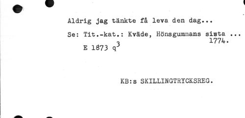 //// * //// Aldrig jag tänkte få leva den dag... //// Se: Tit.-kat.: Kväde, Hönsgummans sista ... //// , 1774. //// E 1873 q^ //// KB:s SKILLINGTRYCKSREG. ////