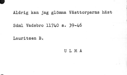 //// Åldrig kan jag glömma Västtorparns häst //// Sdml Vadsbro 11740 s. 39-46 //// Lauritzen B. //// U L M A ////