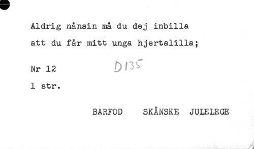 //// Aldrig nånsin må du dej inbilla //// att du får mitt unga hjertalilla; //// Nr 12 f)!^ //// 1 str. //// BARFOD SKÅNSKE JULELEGE ////