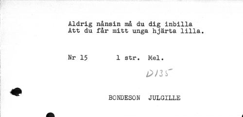 //// i ' . //// * //// Aldrig nånsin må du dig inbilla //// Att du får mitt unga hjärta lilla. //// Nr 15 1 str. Mel. //// I //// r . //// ; //// y //// ! //// BONDESON JULGILLE //// 1 1 ////