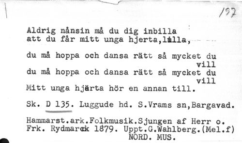 //// Aldrig nånsin må du dig inbilla //// att du får mitt unga hjerta,lmlla, — —- //// du må hoppa och dansa rätt så mycket du //// vill //// du må hoppa och dansa rätt så mycket du //// vill //// Mitt unga hjärta hör en annan till. //// Sk. D 135. Luggude hd. S.Vrams sn,Bargavad. //// Hammarst.ark.Folkmusik.Sjungen af Herr o. //// Frk. Rydmarck 1879. Uppt.G.Wahlberg.(Mel.f) //// ^ NORD. MUS. ////