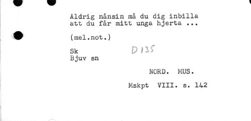 //// Aldrig nånsin må du dig inbilla //// att du får mitt unga hjerta ... //// ! //// tf. //// ? //// _ //// V (mel.not.) //// sk paf //// Bjuv sn //// t //// NORD. MUS. //// Mskpt VIII. s. 142 ////
