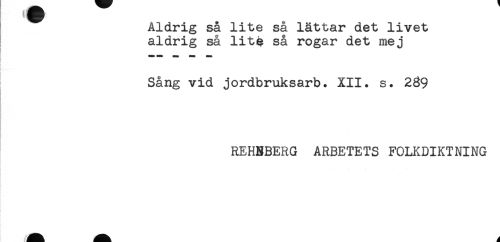 //// ! Aldrig sa lite sa lättar det livet //// ! aldrig så lite så rogar det mej //// I //// i //// Sång vid jordbruksarb. XII. s. 289 //// REHNBERG ARBETETS FOLKDIKTNING ////