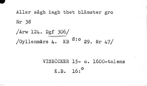 //// < //// Aller sågh iagh thet blåmster gro //// i //// i //// Nr 38 //// /Arw 124. Dgf 306 //// //Gyllenmärs 4. KB 29. Nr 47 //// /< //// VISBÖCKER 15- o. 1600-talens //// K.B. 16:° ////