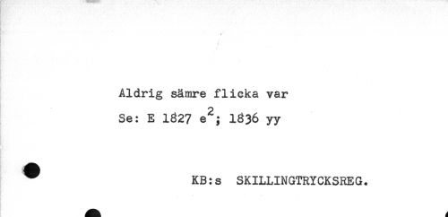 //// L* - //// * //// Aldrig sämre flicka var //// Se: E 1827 e^; 1836 yy //// * //// ^ KB:s SKILLINGTRYCKSREG. ////