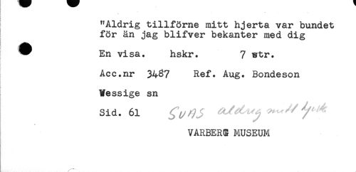 //// t //// "Aldrig tillförne mitt hjerta var bundet //// för än jag blifver bekanter med dig //// ^ En visa. hskr. 7 wtr. //// Acc.nr 34^7 Ref. Aug. Bondeson //// Wessige sn //// Sid. 61 ^J ^^ ^^ //// VARBERtE MUSEUM ////