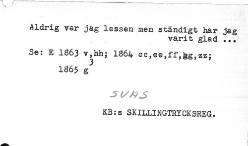 //// Aldrig var jag lessen men ständigt har jag //// varit glad ... //// Se: E 1863 v,hh; 1364 cc,ee,ff,&g,zz; //// 1365 g //// -5 //// KB:s SKILLINGTRYCKSREG. //// 1 //// t //// ! ////