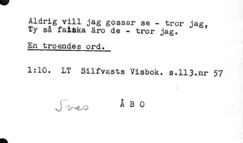 //// Aldrig vill jag gossar se - tror jag, //// Ty så faiaka äro de - tror jag. //// En troendes ord. //// 1:10. LT Silfvasts Visbok. s.H3.nr 57 //// A B 0 ////