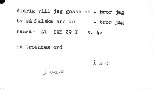 //// Aldrig vill jag gosse se - tror jag //// ty så falska äro de - tror jag //// ramsa LT INE 29 I s. 42 //// . //// ) //// I //// t //// En troendes ord I //// i //// ÅBO ////