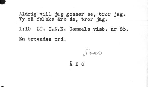 //// Aldrig vill jag gossar se, tror jag. //// Ty så falska aro de, tror jag. //// 1:10 LT. I.N.E. Gammals visb. nr 66. //// En troendes ord. //// ÅBO ////