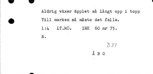 //// Aldrig växer äpplet så långt opp i topp //// ? //// t //// ^ Till marken så måste det falla. //// 1:4 LT.MÖ. INE 60 nr 75. //// ! N. //// ! 2)y //// /! ÅBO //// ! //// ! ** //// ) ////